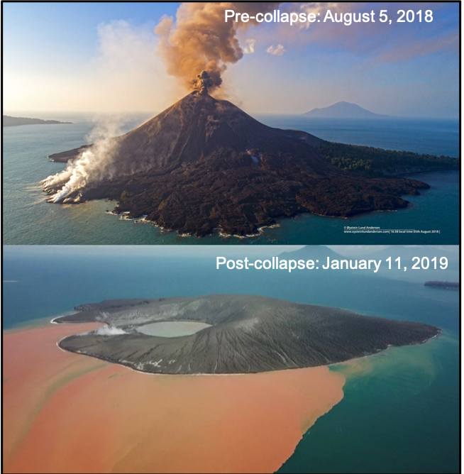 Anak Krakatau before and after the major eruption and collapse of the volcanic cone on December 22, 2018. Photos: Øystein Lund Andersen (top) and James Reynolds (bottom)