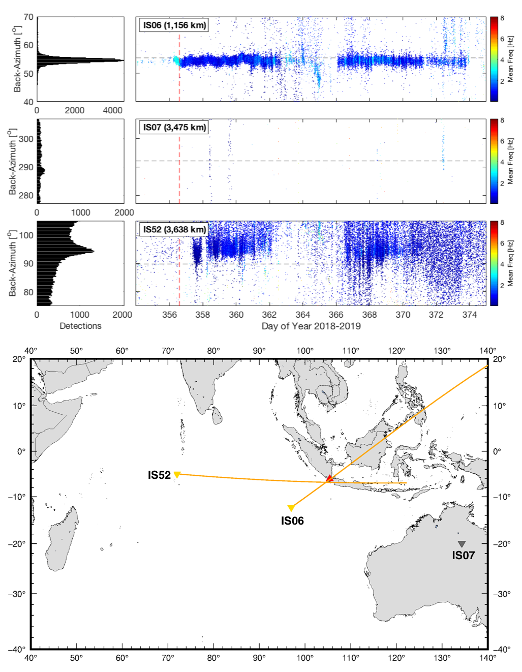 Figure from Rose (2020). Comparison of PMCC bulletin detections at stations IS06, IS07, and IS52. The upper three panels show ±15 degrees from each respective Anak Krakatau back-azimuth (black dashed lines), with a vertical red dashed line indicating the flank collapse event. A large number of detections are present at station IS06, beginning on day 356 (December 22, 2018) and continuing to early January 2019. Station IS07 does not show sustained detections from Anak Krakatau. Station IS52 detected continuous detections near the correct back-azimuth of the volcano for this time frame, though these don’t capture the start of the eruption or flank collapse and are partially obscured by microbarom clutter. Bottom panel: detection cross-bearings for the two infrasound stations where coherent detections were observed. The mean back-azimuth of PMCC detections attributed to Anak Krakatau were calculated for IS06 and IS52, and the great circle paths at those back-azimuths are indicated by solid orange lines. The location of Anak Krakatau is indicated by a red triangle. The back-azimuth intersection location is 124 km from true. Station IS07 is indicated by a gray inverted triangle and no detection path shown due to lack of coherent sustained infrasound from the eruption at this station.