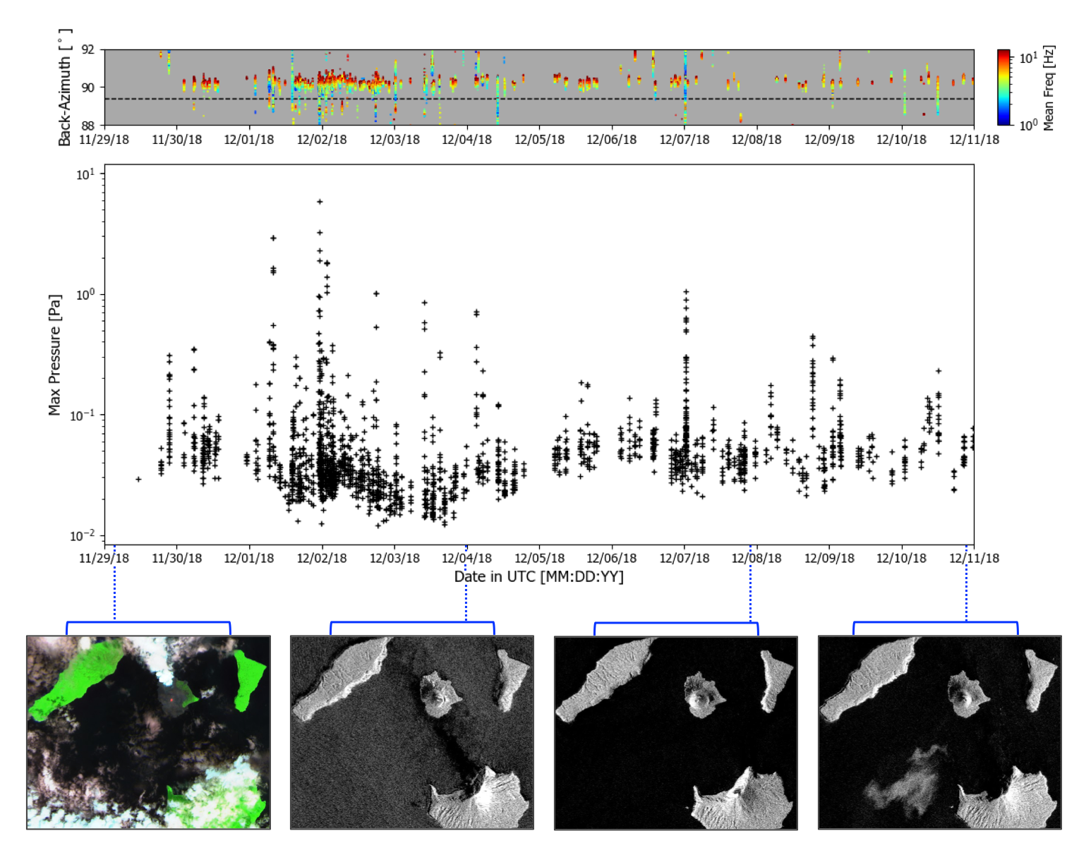Figure from Rose (2020). top panel shows PMCC detections coming from the direction of Anak Krakatau volcano. Middle panel shows the maximum amplitude of each of the 10,324 automatically picked events. Bottom panels show SAR imagery from Sentinel-1 satellite.
